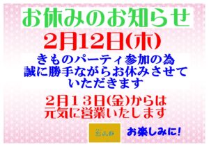 - 2026年2月12日 きものパーティ参加の為お休みさせていただきます