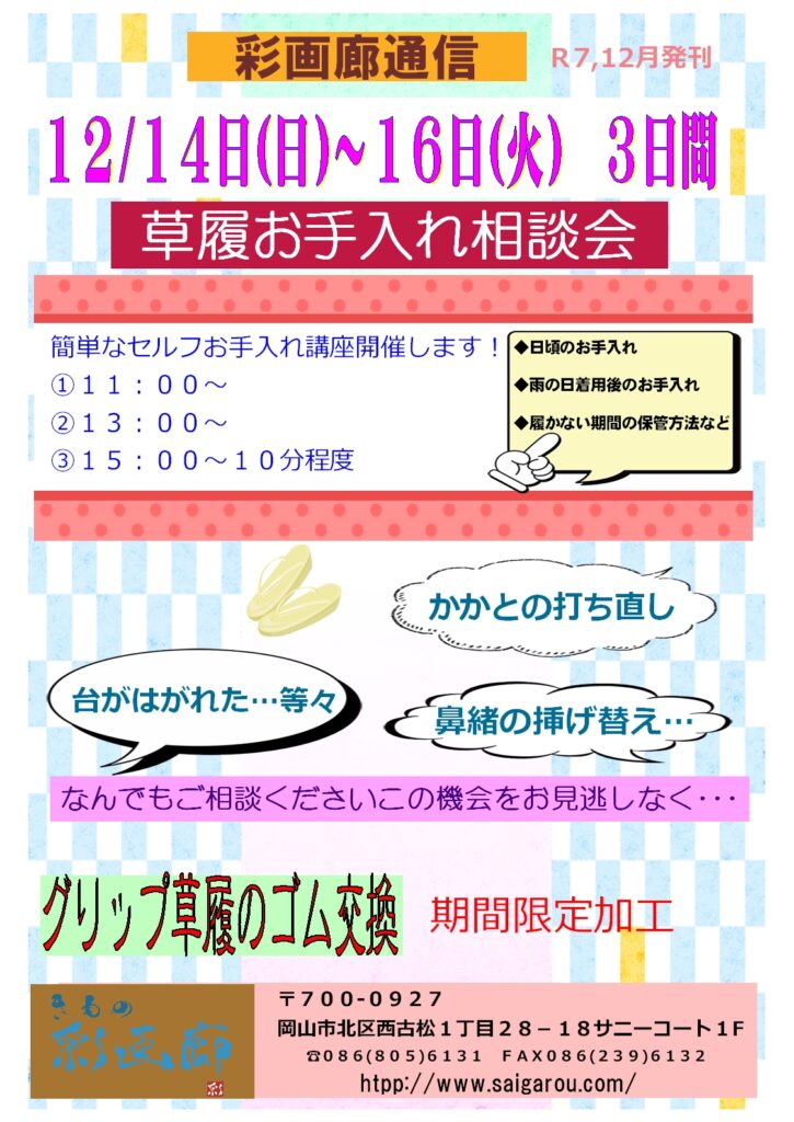 12月14日(日)から3日間「草履お手入れ相談会」開催します